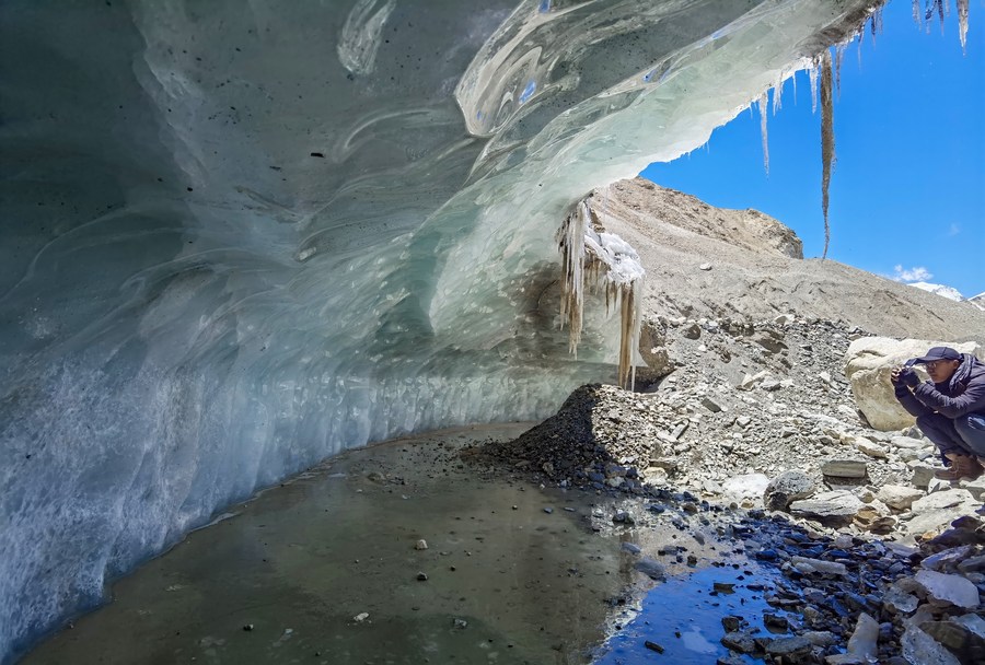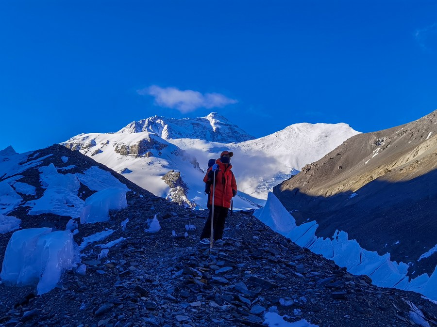 冰川與污染物小組在東絨布冰川觀察測(cè)量(5月6日攝,手機(jī)照片)。新華社發(fā)(受訪者供圖)