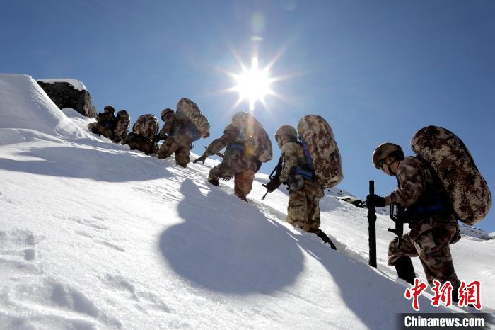 圖為巡邏官兵翻越雪山。馬軍 攝