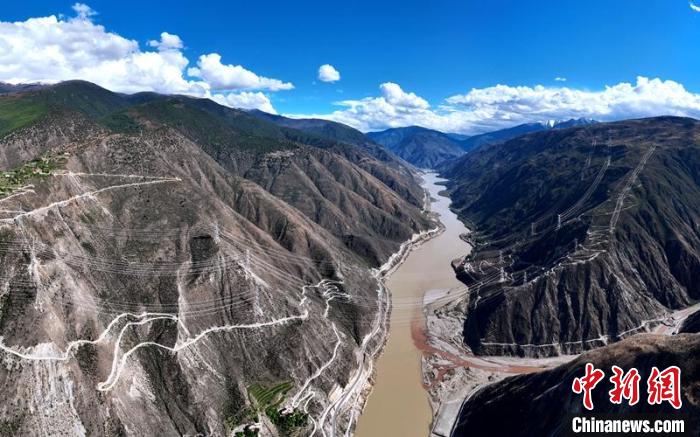 蘇洼龍水電站500千伏送出工程(中)與川藏聯網鏈路(兩側)并行跨越金沙江大峽谷?!⑾驸C 攝