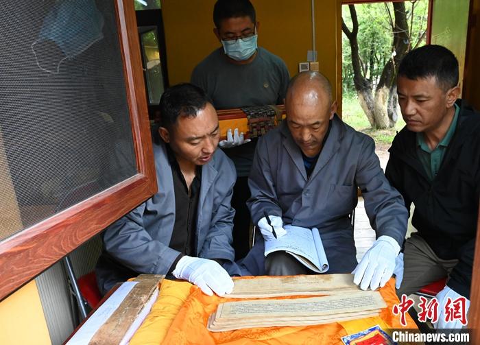 圖為6月27日,拉薩,羅布林卡管理處兩位專職古籍審核人員(左一、左三)登記檢查古籍并做交接。 中新社記者 趙朗 攝
