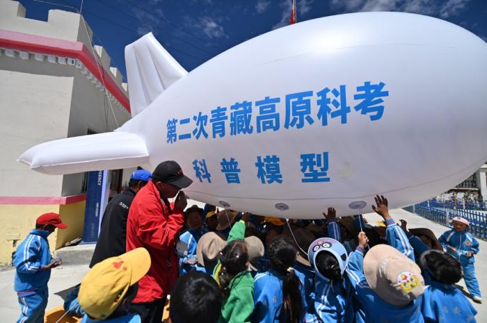中科院珠峰站觀測(cè)主管席振華(左四)為小朋友們講解浮空艇原理