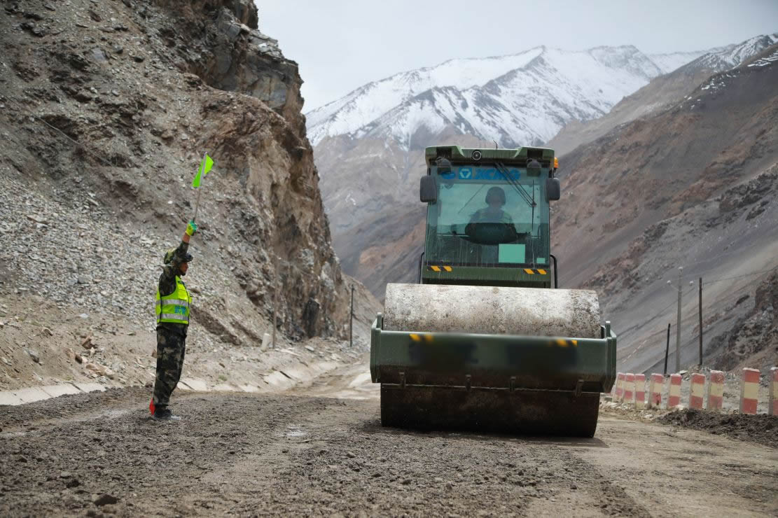 在相隔數(shù)百公里外的麻扎達(dá)坂路段,官兵們面臨的又是另一番景象,他們冒著嚴(yán)寒降雪天氣搶修沉降路基道路,現(xiàn)場分工后,隨后對兩端道路實(shí)施安全警戒,并做好過往群眾安撫解釋工作。指揮員高效指揮,操作手協(xié)同配合,安全員實(shí)時(shí)觀察山體情況,峽谷間機(jī)械馬達(dá)轟鳴、濃煙滾滾。2小時(shí)后,一段200多平方米的路基水穩(wěn)層全部鋪設(shè)完成,官兵們有序指揮車輛通行,司機(jī)分別鳴笛揮手向筑路兵致敬。