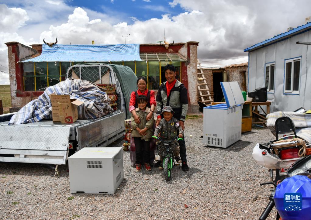 雙湖縣多瑪鄉(xiāng)果根擦曲村牧民貢布旺青和家人在等待運(yùn)送家具的車輛(7月12日攝)。新華社記者 晉美多吉 攝