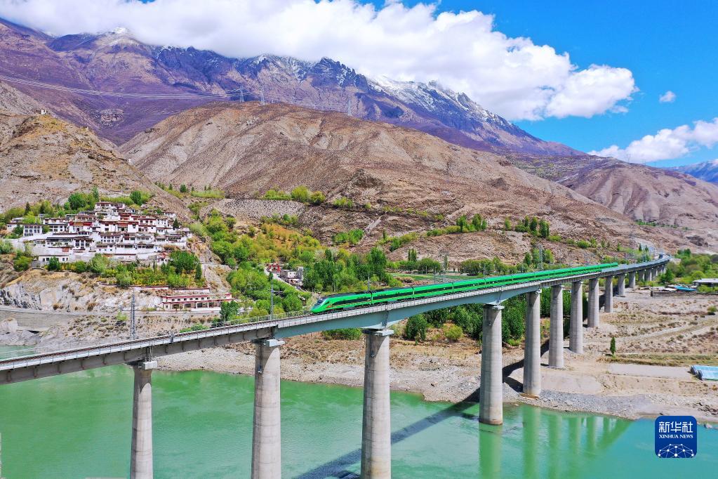 復興號列車行駛在西藏朗縣境內(nèi)(2022年4月14日攝)。新華社記者 覺果 攝