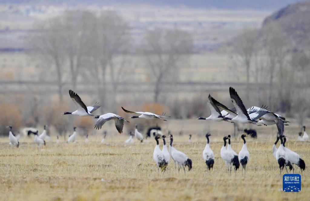 黑頸鶴在林周縣黑頸鶴自然保護(hù)區(qū)上空盤(pán)旋(11月6日攝)。新華社記者 張汝鋒 攝
