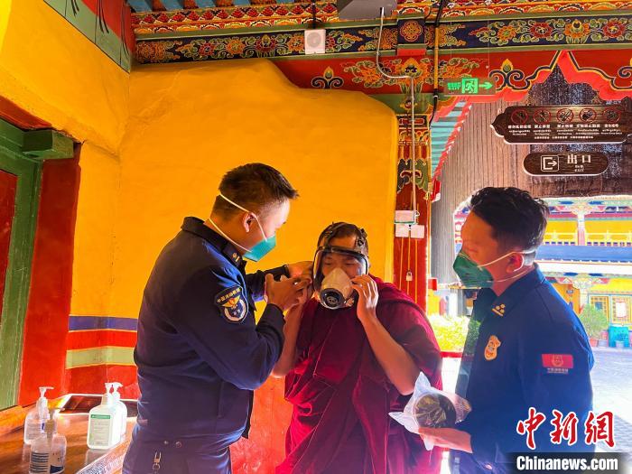 圖為消防員指導僧人學習佩戴防煙防毒面具?!±_市消防救援支隊供圖
