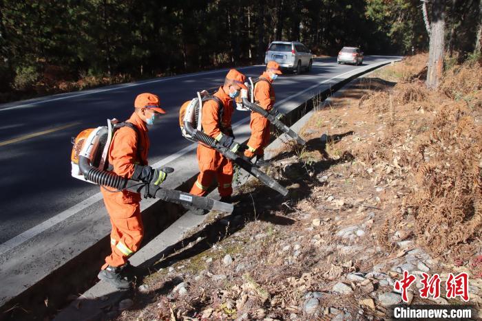 消防隊(duì)員利用風(fēng)力滅火機(jī)收攏國(guó)道旁可燃物?!⊥鯘蓷?攝