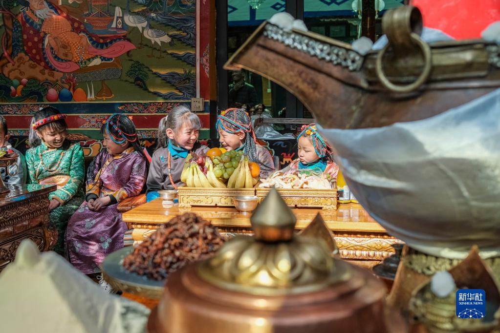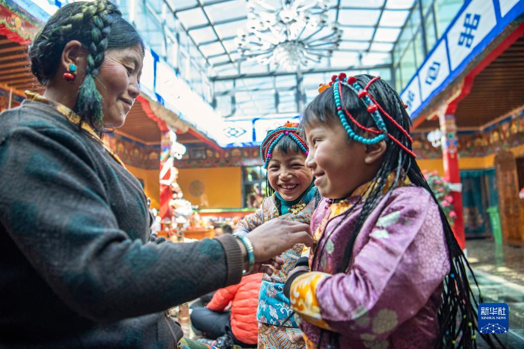 今年,日喀則藏歷農(nóng)家年和春節(jié)“巧遇”同一天,雖習俗不同,但年味皆濃。次旦的兒孫早早開車去縣城采買了年貨,兒媳婦們在家準備過年吃的羊頭、切瑪?shù)葌鹘y(tǒng)特色美食。家中的第四代,次旦老人的重孫子和重孫女們,則穿上了漂亮的藏裝,頭戴綠松石點綴的頭飾,在家中歡快地跑來跑去。