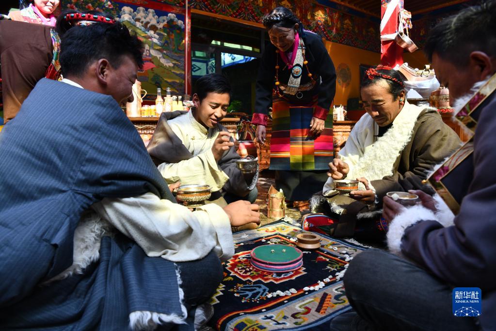 在位于西藏日喀則拉孜縣扎西宗鄉(xiāng)雜村的家中,次旦老人一臉幸福的微笑,家中小輩正輪流上前和她行碰頭禮。