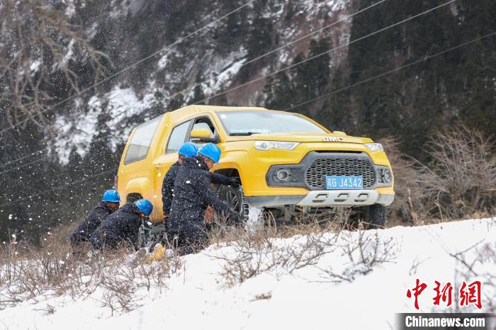 盤山公路上,積雪和暗冰使車輛打滑無法繼續(xù)前行,羅布頓珠和隊(duì)友只好下車,給車輛掛好防滑鏈繼續(xù)前行,原本兩個小時的車程,這次花了4個小時才抵達(dá)巡線點(diǎn)。