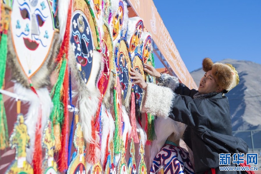 2月6日,達(dá)孜區(qū)阿古傳統(tǒng)藏戲服飾農(nóng)牧民專(zhuān)業(yè)合作社工作人員在交易會(huì)上推銷(xiāo)藏戲面具。新華網(wǎng) 旦增努布 攝