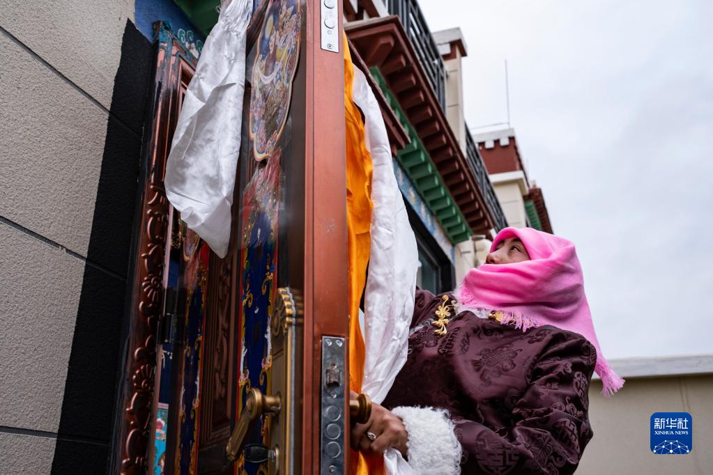 石秀次仁的家人往門上掛哈達(dá),祝福新一年吉祥如意(2月19日攝)。