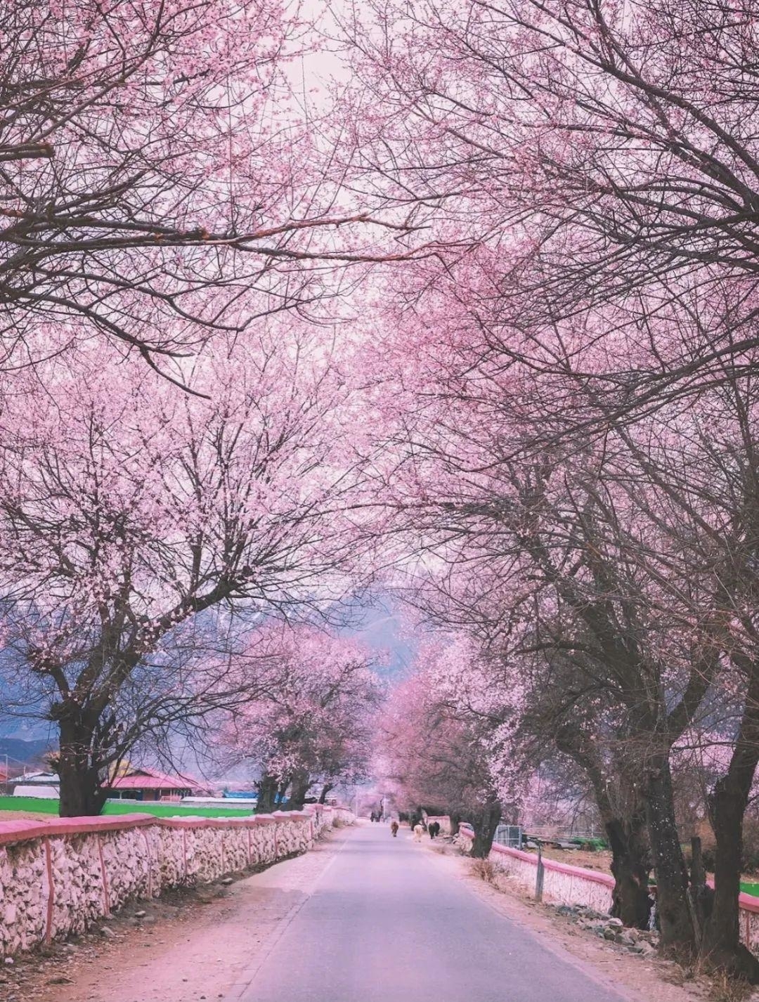 三月初綻的桃花就是這里的迎春花,遠(yuǎn)處雪峰矗立潔白,近處溪流潺潺清澈,再加上漫山遍野粉色的桃花與田間的青苗交相輝映,鋪滿山坡,伸向河谷,蔚然成花海。