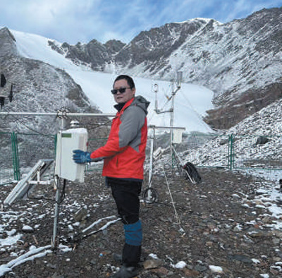 王飛騰在天山烏魯木齊河源1號冰川綜合觀測場觀測?!∮浾?王錦濤攝