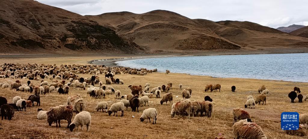 羊卓雍錯湖邊的羊群(5月1日攝,手機(jī)照片)。新華社記者 沈虹冰 攝