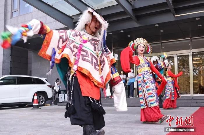 5月23日,“2023·中國西藏發(fā)展論壇”在北京舉行。會場外,活潑獨特的藏式迎賓舞蹈、展示西藏人文自然風貌的圖片,已在論壇開幕前預熱起探討西藏新發(fā)展的氛圍。圖為藏式迎賓舞蹈。中新社記者 蔣啟明 攝