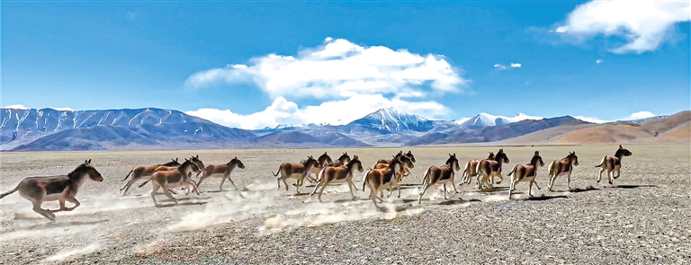 圖為在羌塘國(guó)家級(jí)自然保護(hù)區(qū)內(nèi)奔跑的藏野驢。邊巴多吉 攝