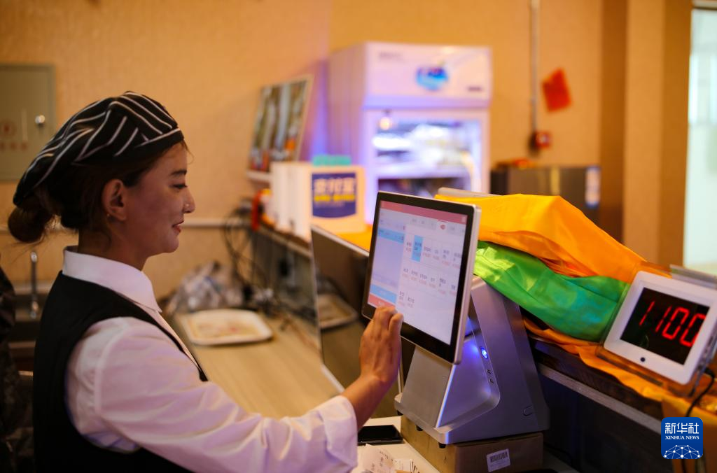多爾格村村民尼達(dá)卓瑪在合作社開辦的茶館前臺(tái)收銀(7月11日攝)。新華社記者 姜帆 攝