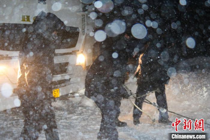 來到現(xiàn)場后楊軍發(fā)現(xiàn),該路段積雪超過半米深,車輛已經(jīng)深陷其中無法行駛。楊軍立即組織民警用鐵鍬鏟雪、人力助推、繩索牽引等進(jìn)行施救,經(jīng)過一個(gè)多小時(shí)的努力,成功將部分被困車輛救出。可現(xiàn)場風(fēng)雪突然變大,下雪速度遠(yuǎn)超過救援速度,轉(zhuǎn)眼間,路面積雪接近1米高,到深夜時(shí),雙向車道上被困車輛、人員已達(dá)17輛、49人,看到情況越來越嚴(yán)峻,楊軍迅速對接、協(xié)調(diào)駐地交通部隊(duì)共同開展救援。
