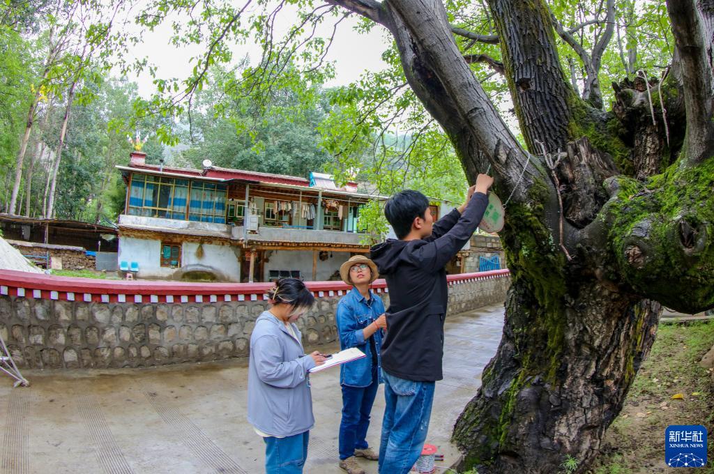 劉利平博士(中)在加查縣安繞鎮(zhèn)熱果村指導(dǎo)學(xué)生給一株古核桃樹掛牌(7月27日攝)。新華社記者 姜帆 攝