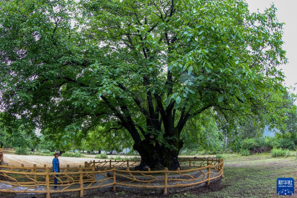 劉利平博士在加查縣安繞鎮(zhèn)熱果村查看一株樹齡1800余年的古核桃樹(7月27日攝)。新華社記者 旦增尼瑪曲珠 攝