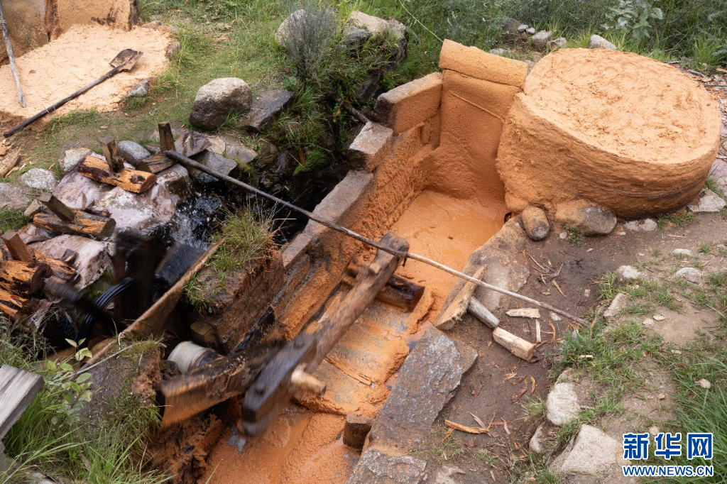 圖為水磨不斷研磨柏木使其成漿(8月21日攝)。新華網(wǎng)發(fā) 李騰 攝