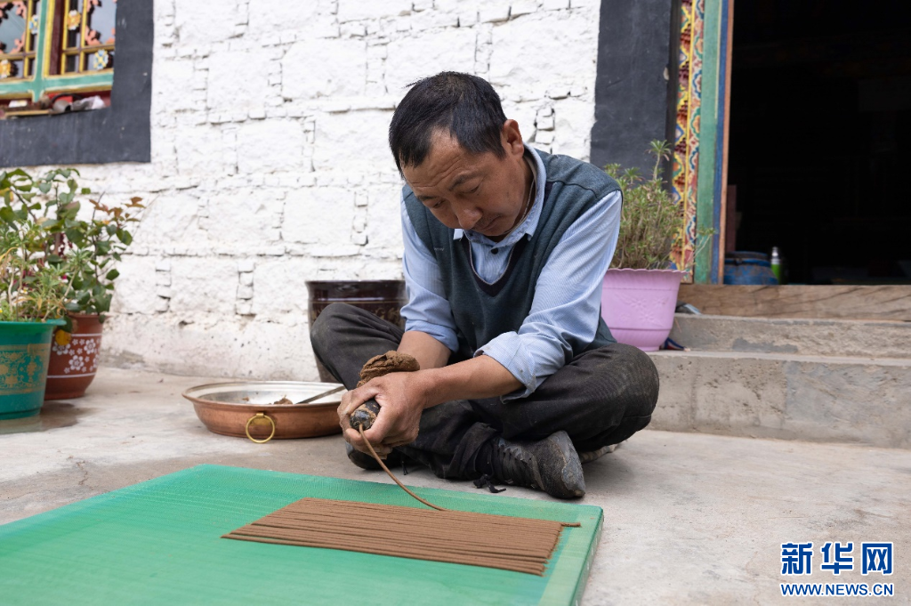 工作時(shí),格桑次仁會(huì)盤腿坐于門前,熟練地揉搓著盆中的香泥,待其成型后再迅速放入帶孔的牛角中,用靈巧的手指擠出一道道筆直的線條,一根根均勻的藏香便呈現(xiàn)在人們的眼前。經(jīng)過晾曬成型之后,這些藏香將會(huì)被送至附近的大小寺廟,或是通過電商渠道發(fā)往全國(guó)各地。