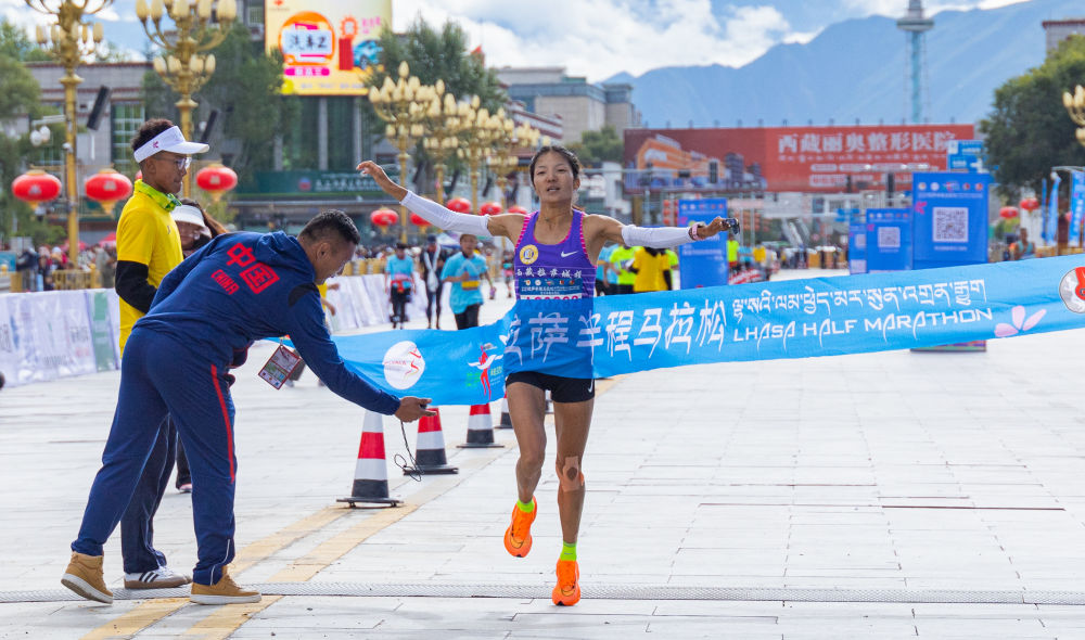 2023拉薩半程馬拉松女子組選手次仁措姆沖線奪冠瞬間。新華社發(fā)(丁增尼達 攝)