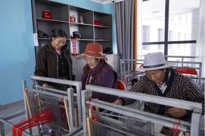 圖為綜合實(shí)訓(xùn)樓內(nèi),曲增(左)在教當(dāng)?shù)剞r(nóng)牧民制作藏式腰帶
