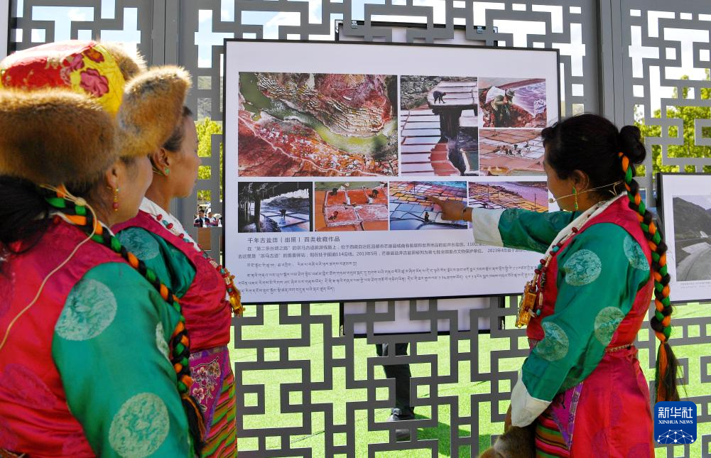 在拉薩市林周縣邊交林鄉(xiāng)當(dāng)杰村,人們?cè)谛蕾p第十六屆西藏珠穆朗瑪攝影大展作品(9月8日攝)。新華社記者 張汝鋒 攝?