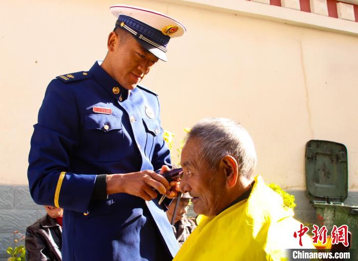 圖為林芝市森林消防支隊波密中隊消防員正在為老人理發(fā)。馮怡凡 攝