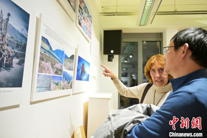維也納商會市場部主席馬庫斯·漢茨(Markus Hanzl)參觀“和美西藏”攝影展。歐洲時(shí)報(bào)記者 周修怡 攝