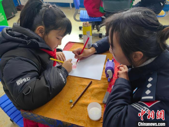 圖為玉麥邊境派出所民警與小朋友一起畫畫。扎西根培 攝