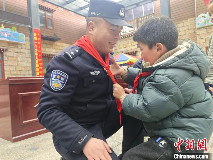 圖為小朋友正在為玉麥邊境派出所民警佩戴紅領巾。扎西根培 攝