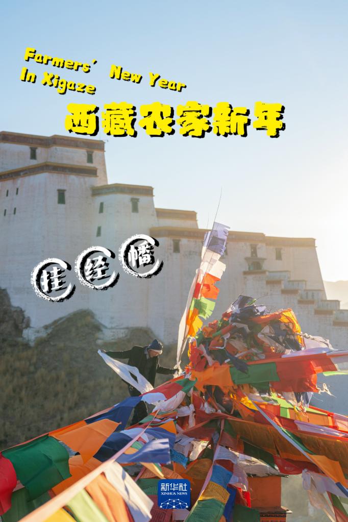 農(nóng)家新年大年初三,日喀則市桑珠孜區(qū)藏族群眾沿襲傳統(tǒng),清晨在山頂和自家屋頂上豎起嶄新的經(jīng)幡,祈愿新的一年國(guó)泰民安(1月14日攝)。