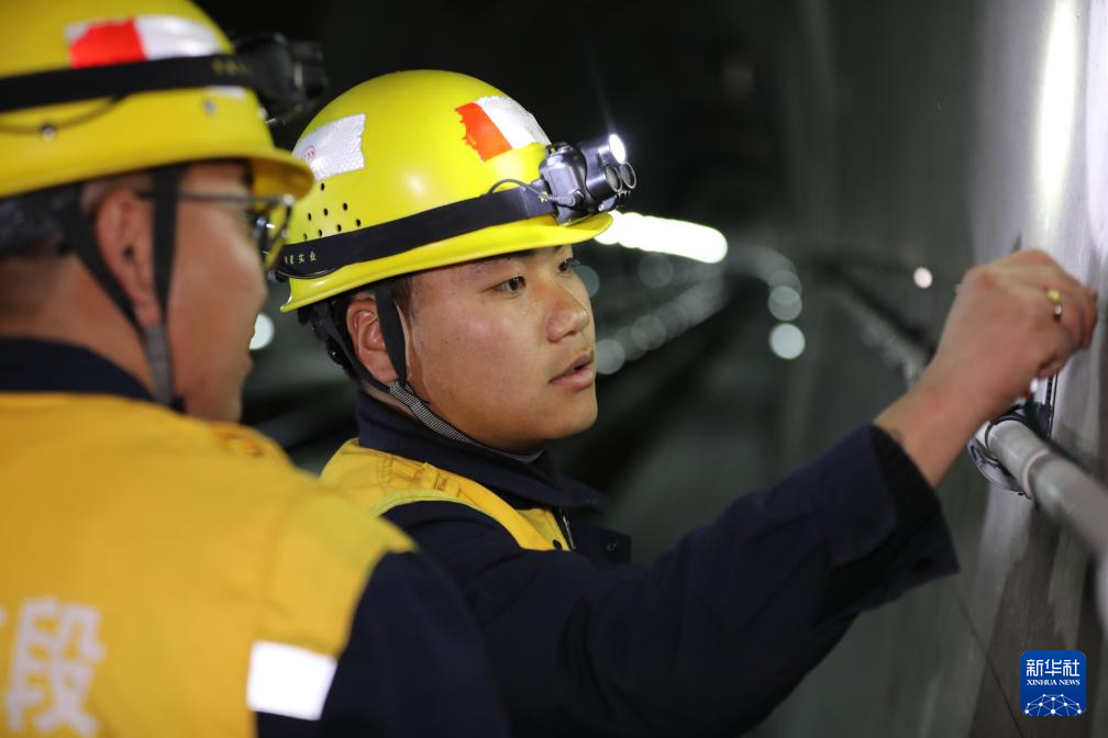 加查橋隧工區(qū)副工長東生瑞(左)檢查達(dá)嘎拉隧道狀況(1月27日攝)。新華社發(fā)(拉巴次仁攝)