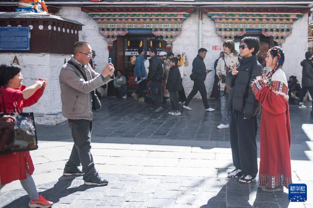 2月11日,游客在西藏拉薩八廓街拍照留念。新華社記者 孫瑞博 攝