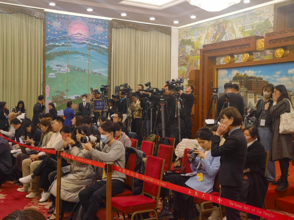 3月6日下午,中外記者在人民大會(huì)堂西藏廳參加十四屆全國(guó)人大二次會(huì)議西藏代表團(tuán)開(kāi)放團(tuán)組活動(dòng)。(新華社記者韓潔 攝)