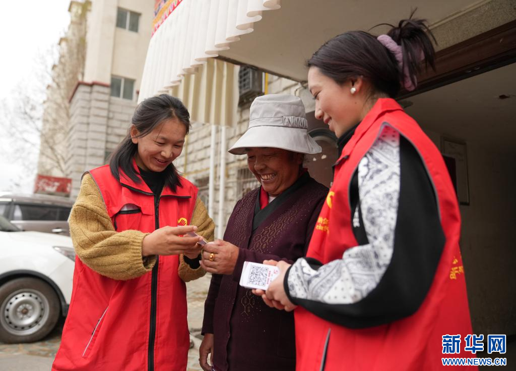4月2日,納金村居民和工作人員為網(wǎng)格便民二維碼點(diǎn)贊。(新華社記者 晉美多吉 攝)