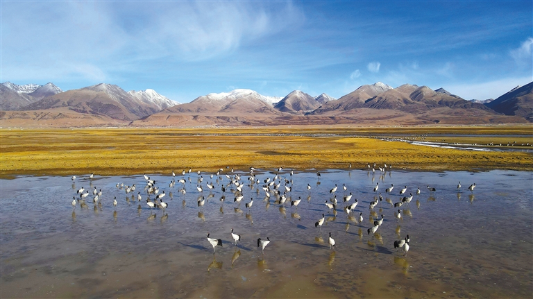 數(shù)量逐年增多的黑頸鶴成群遷徙停歇或繁殖,正是對(duì)當(dāng)雄縣生態(tài)環(huán)境持續(xù)向好的最美注腳。當(dāng)雄縣自然資源局(林業(yè)和草原局)局長楊光富說:“近年來,當(dāng)雄縣始終堅(jiān)持‘綠水青山就是金山銀山、冰天雪地也是金山銀山’的發(fā)展理念,率先在拉薩市成功創(chuàng)建全國生態(tài)文明示范縣和‘兩山’實(shí)踐創(chuàng)新基地。這兩塊金字招牌充分體現(xiàn)了當(dāng)雄的生態(tài)底色。下一步,我們將在全縣草原生態(tài)保護(hù)中重點(diǎn)突出阿熱濕地保護(hù),探索濕地黑頸鶴、斑頭雁等珍稀野生動(dòng)物活動(dòng)的特點(diǎn)規(guī)律,促進(jìn)濕地保護(hù)管理與濕地資源合理利用有機(jī)融合,確保探索形成守綠換金、添綠增金、點(diǎn)綠成金的‘兩山’轉(zhuǎn)化模式?!?/p>