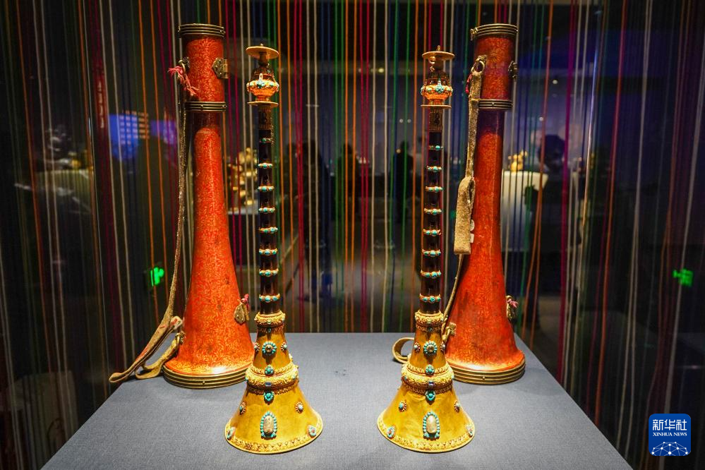 5月11日,“布達拉宮——來自雪域的世界文化遺產(chǎn)”展覽現(xiàn)場展出的“藏式嗩吶”。新華社記者 李博 攝