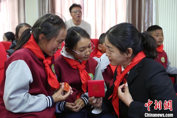 圖為單增卓嘎正在為學(xué)生們展示和講解莊嚴(yán)的法徽。倫珠澤仁攝