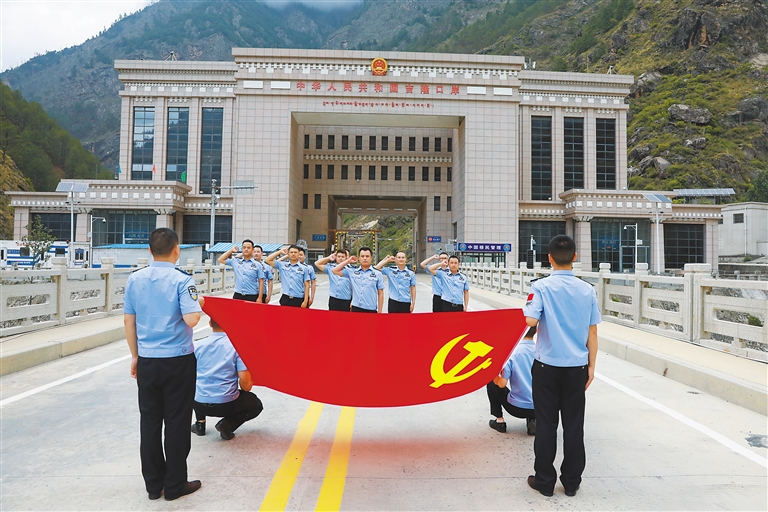 圖為吉隆出入境邊防檢查站組織黨員民警在國(guó)門前重溫入黨誓詞。記者 旦增蘭澤 通訊員 肖富貴 攝