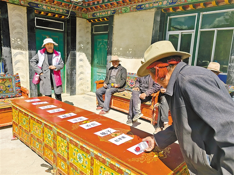 老人積極參與滾瓶水果挑戰(zhàn)趣味游戲。記者 次仁片多 攝