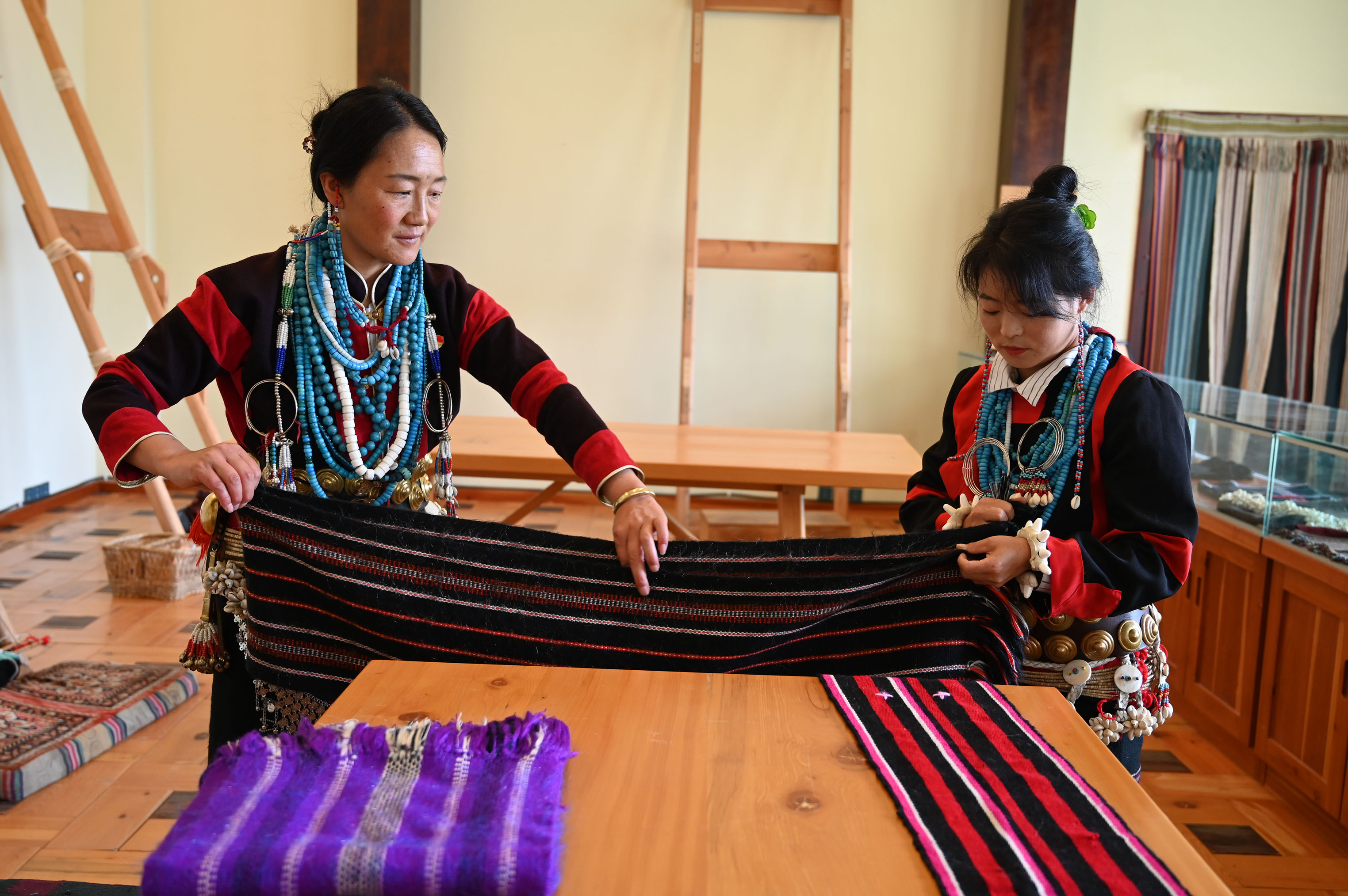 41歲的亞達(dá)兒不僅是才召村的婦聯(lián)主席,也是村里有名的黨員致富帶頭人。2007年,亞達(dá)兒開始向珞巴織布非遺傳承人亞依學(xué)習(xí)織布技藝。2014年,在相關(guān)部門的扶持下,米林珞巴族織布服飾加工傳習(xí)所在才召村成立,并聘請珞巴手工藝人亞依擔(dān)任教師,組織村里的年輕婦女進(jìn)行系統(tǒng)學(xué)習(xí)。