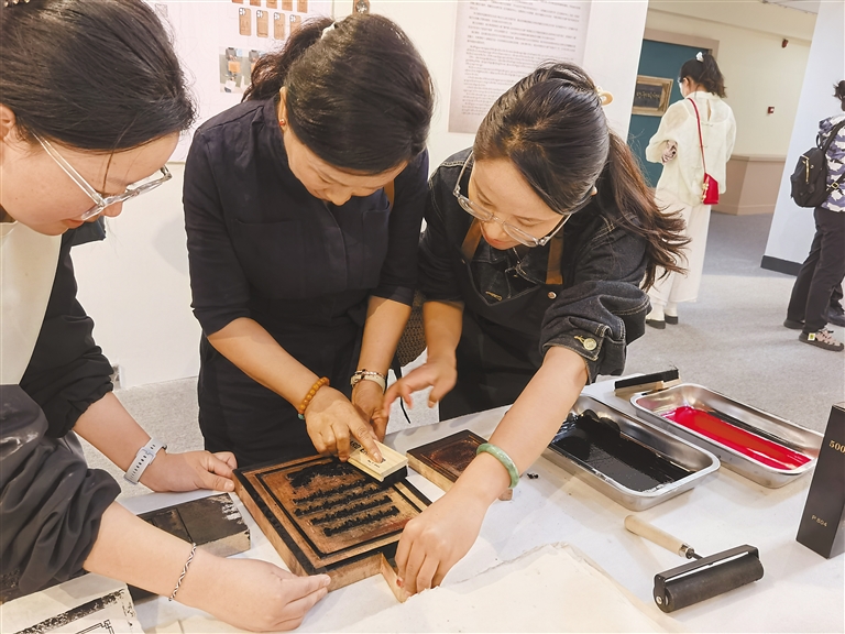 圖為展覽現(xiàn)場,參觀者在體驗雕版印刷。記者 鄭璐 袁海霞 攝