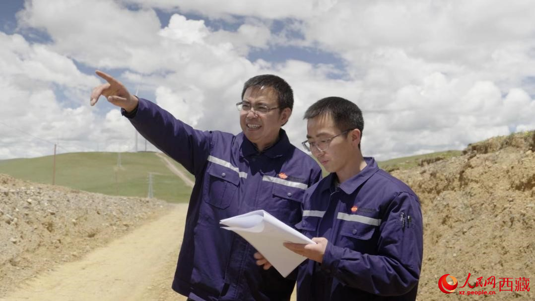 國家能源集團西藏那曲分公司副總經(jīng)理胡建生(左一)和同事在一起工作。人民網(wǎng)記者 趙晨攝