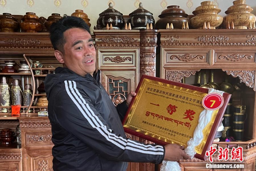“這是我去年獲得的西藏自治區(qū)首屆農(nóng)牧民國家通用語言文字演講比賽一等獎,我當(dāng)時演講的主題就是民族團(tuán)結(jié)?!痹诹种ユ?zhèn)嘎拉村黨支部宣傳委員、村委會副主任尼瑪多吉家中,主人正自豪地向記者們展示著獲獎牌匾。