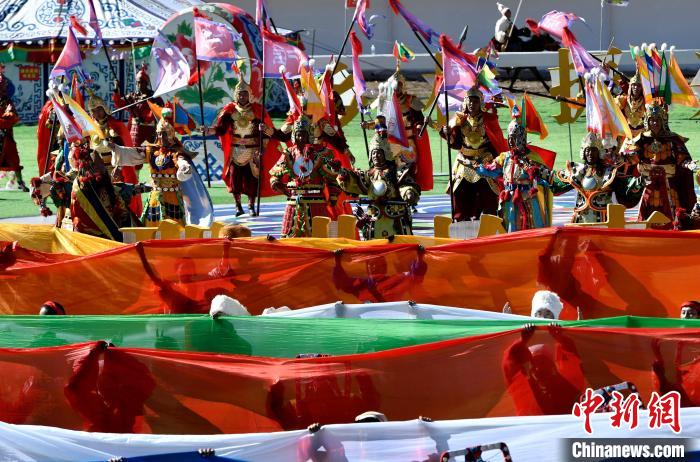 8月10日,2024年那曲恰青賽馬節(jié)暨第三屆“鄉(xiāng)村振興 那曲奮進(jìn)”活動(dòng)開幕式在那曲市賽馬場(chǎng)舉行,精彩的文藝歌舞、馬術(shù)表演等展示著羌塘草原上的無窮魅力和活力。圖為開幕式文藝表演現(xiàn)場(chǎng)。中新社記者 李林 攝