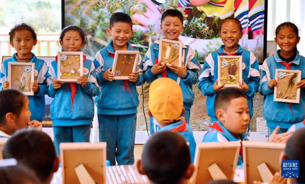8月15日,拉魯小學的學生在拉魯濕地國家級自然保護區(qū)管理局科普小教室里向大家展示優(yōu)秀植物標本。